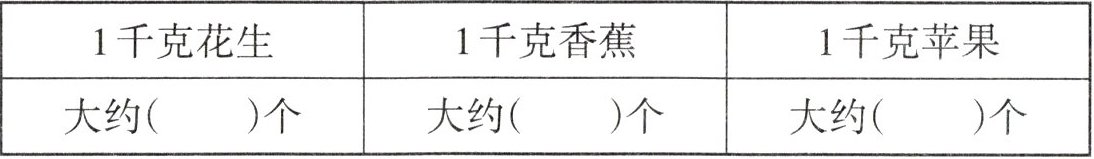 四、1. 分别称出1千克花生、1千克香蕉、1千克苹果,数一数大约有多少个,再填表。