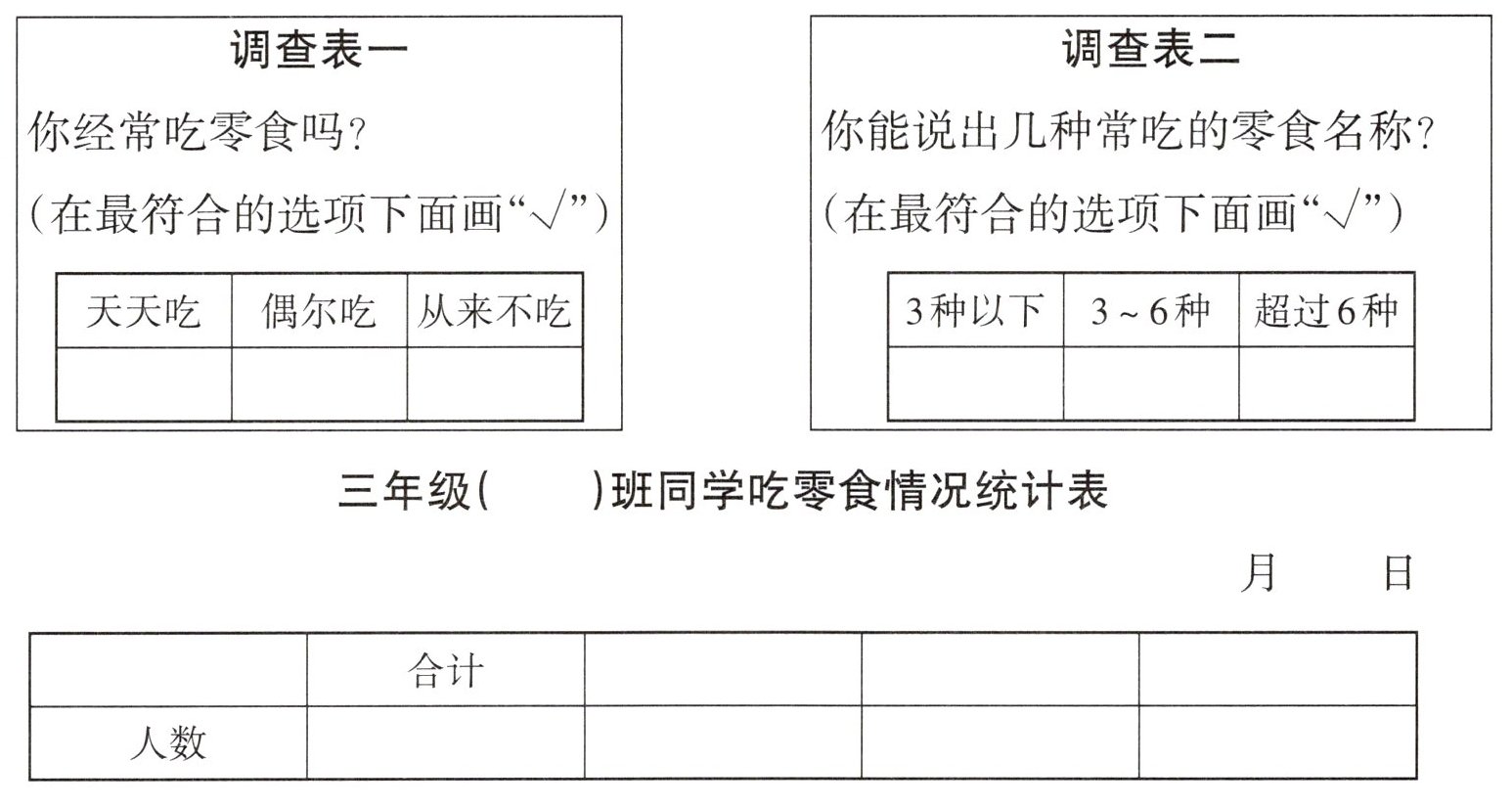 二、从下面调查表中选择一种,了解全班同学吃零食的情况,并根据收集的数据完成统计表。