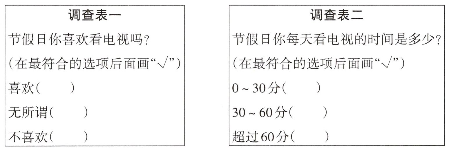 一、为了了解全班同学节假日看电视的情况,乐乐设计了如下两种调查表。你觉得可以使用哪一种调查表?理由是什么?