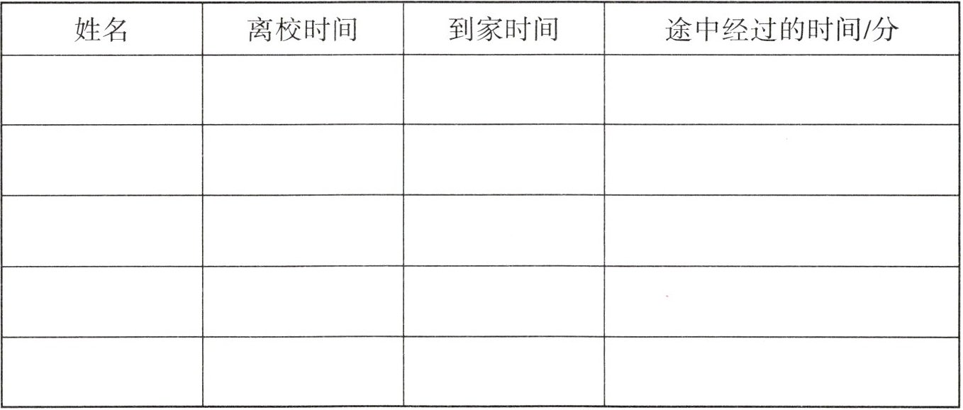 二、记录你的5名同学放学回家时的离校时间和到家时间,并算出从学校到家途中经过的时间。