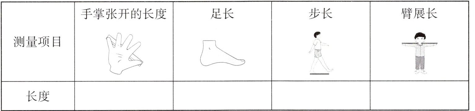 1. 我们身体上有很多“尺子”可以帮助我们测量。你知道你身上的各种“尺子”是多长吗?请你来量一量。(填写数据时,别忘记长度单位)