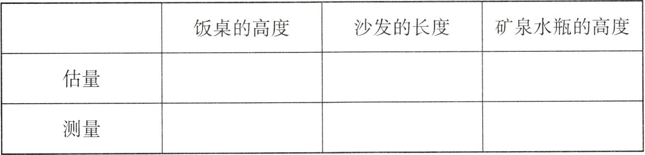 | | 饭桌的高度 | 沙发的长度 | 矿泉水瓶的高度 |