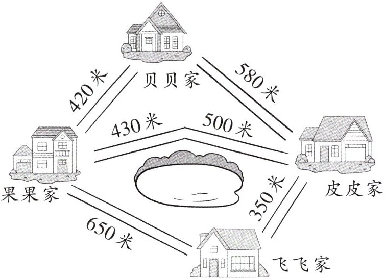 (2)果果从家出发去皮皮家,一共有几条路可以走?最少要走多少米?