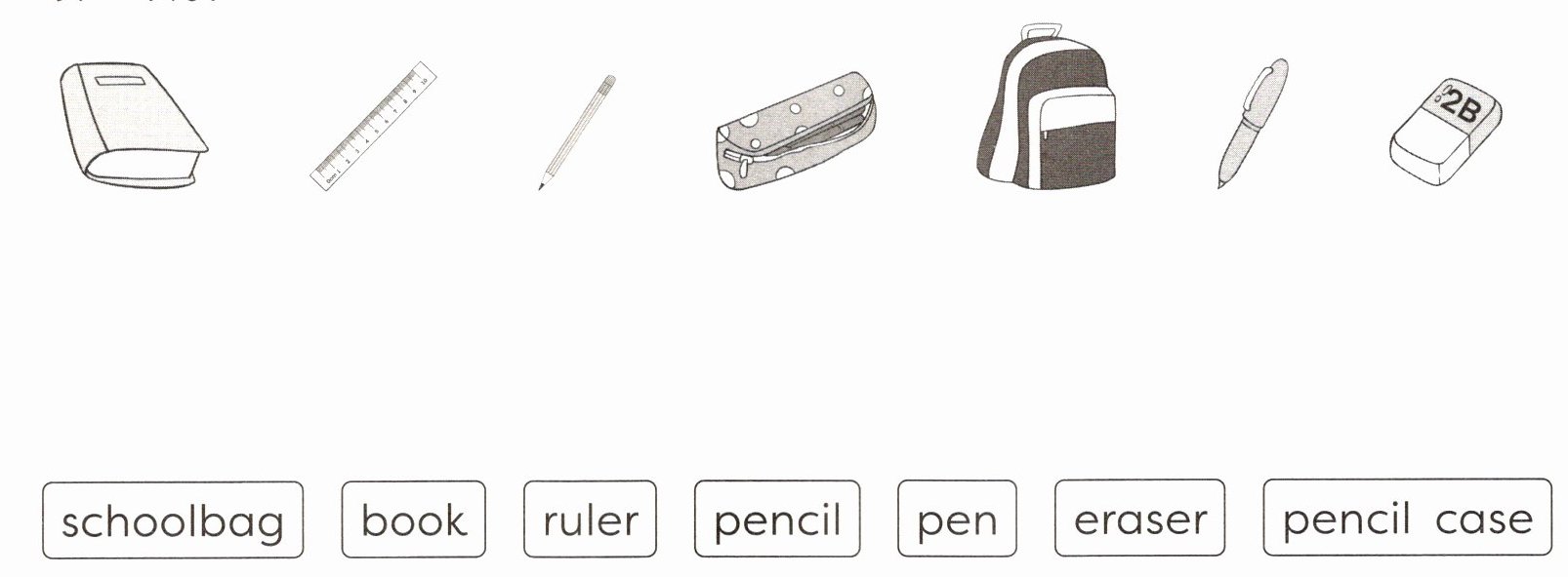 Ⅰ. Look and match, then read. (开学了,教室文具角的学习用品和词汇卡乱作一团,快动手连一连,让它们归位!请将图片与对应的词汇卡连线,并读一读。)