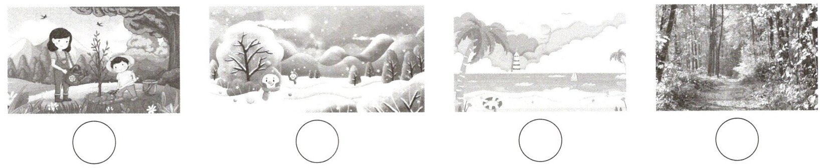 Ⅰ. Listen and order. (Daming 和 Lingling 在四季之旅中,发现了一本神秘的“四季魔法书”。但书中的图片被风吹散了。请听录音,根据所听到的内容用数字 1—4 给下列图片排序。)