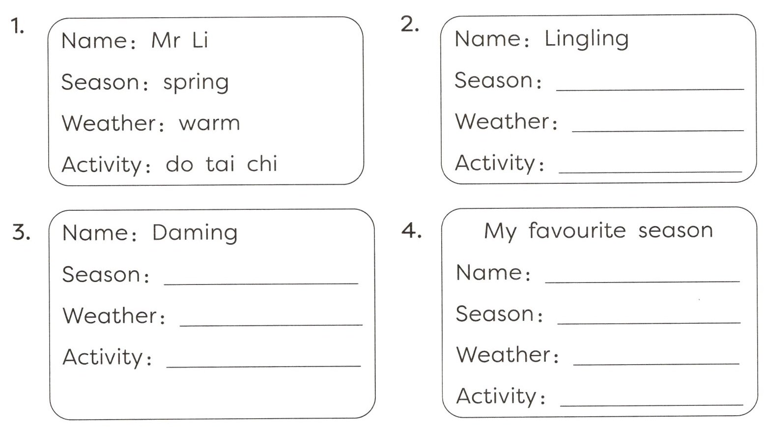 Ⅲ. Read and write. (魔法书中精彩地讲述了 4 个小朋友各自喜爱的季节。请读一读,根据小朋友的描述,填入恰当的四季单词吧!)