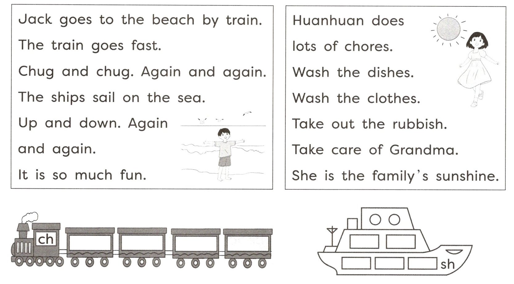 sh: ships, Wash, dishes, clothes, rubbish, She, sunshine