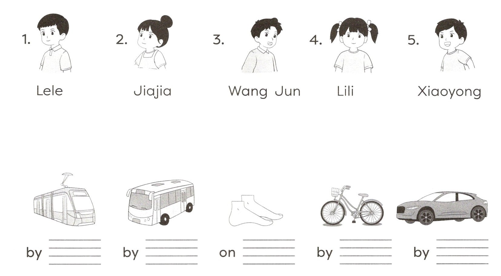 1. Lele 2. Jiajia 3. Wang Jun 4. Lili 5. Xiaoyong by bus by foot on bike by tram by car