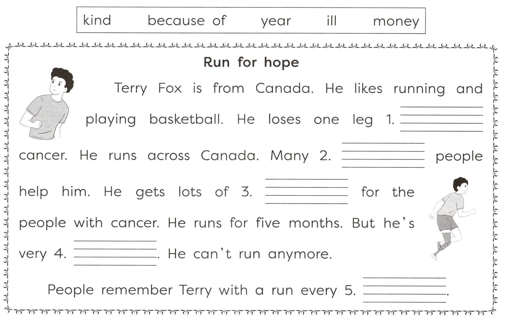 Ⅲ. Read and write.(Daming深受Terry Fox鼓舞,他制作了一张手抄报。请选词填空,与他一起把内容补充完整。)