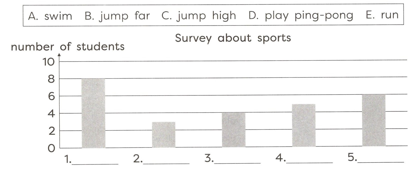 Ⅱ. Listen and choose. (Daming 根据同学们的运动能力调查结果做了一张统计图。请听录音,选择相应的运动项目,帮他补充完整。)
