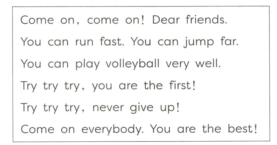 Come on, come on! Dear friends. You can run fast. You can jump far. You can play volleyball very well. Try try try, you are the first! Try try try, never give up! Come on everybody. You are the best!