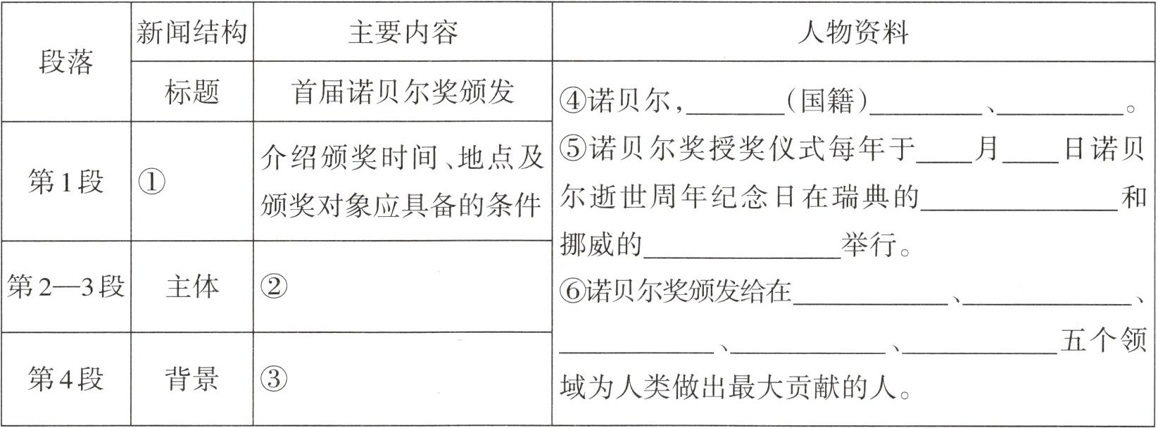 ①导语 ②获奖者的情况、颁奖机构及颁奖时间和地点 ③诺贝尔奖奖金来源及运作模式 ④瑞典 化学家 工程师 ⑤12 10 斯德哥尔摩 奥斯陆 ⑥物理学、化学、生理学或医学、文学、和平事业