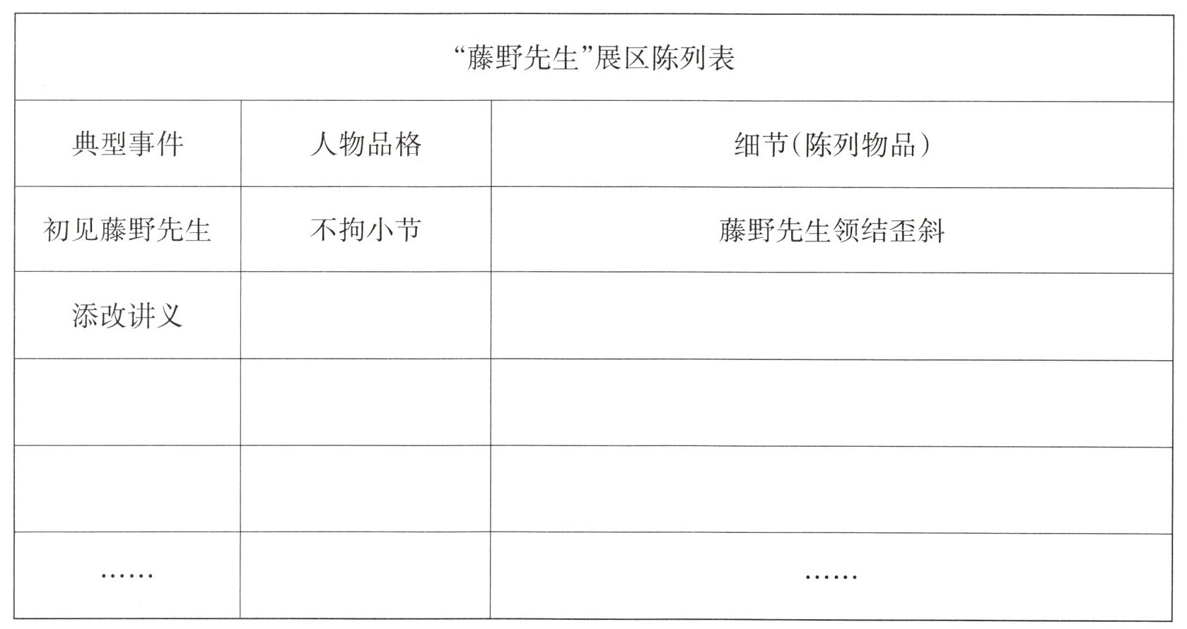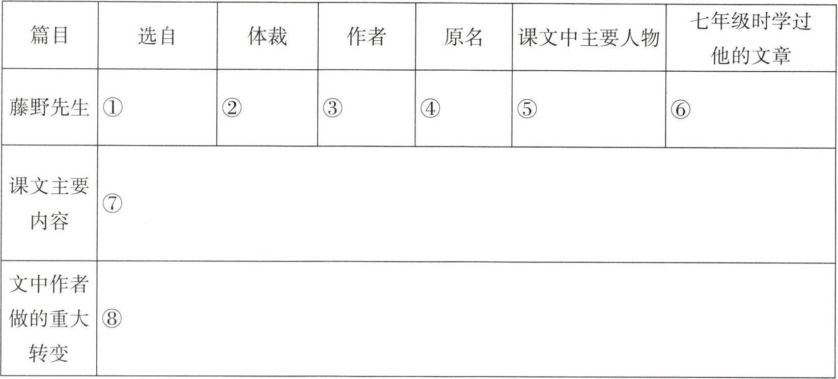 (2) 鲁迅故居制作了“藤野先生”展区陈列表,展示藤野先生的风采。请你整体感知《藤野先生》一文,依据所给提示完成此表。