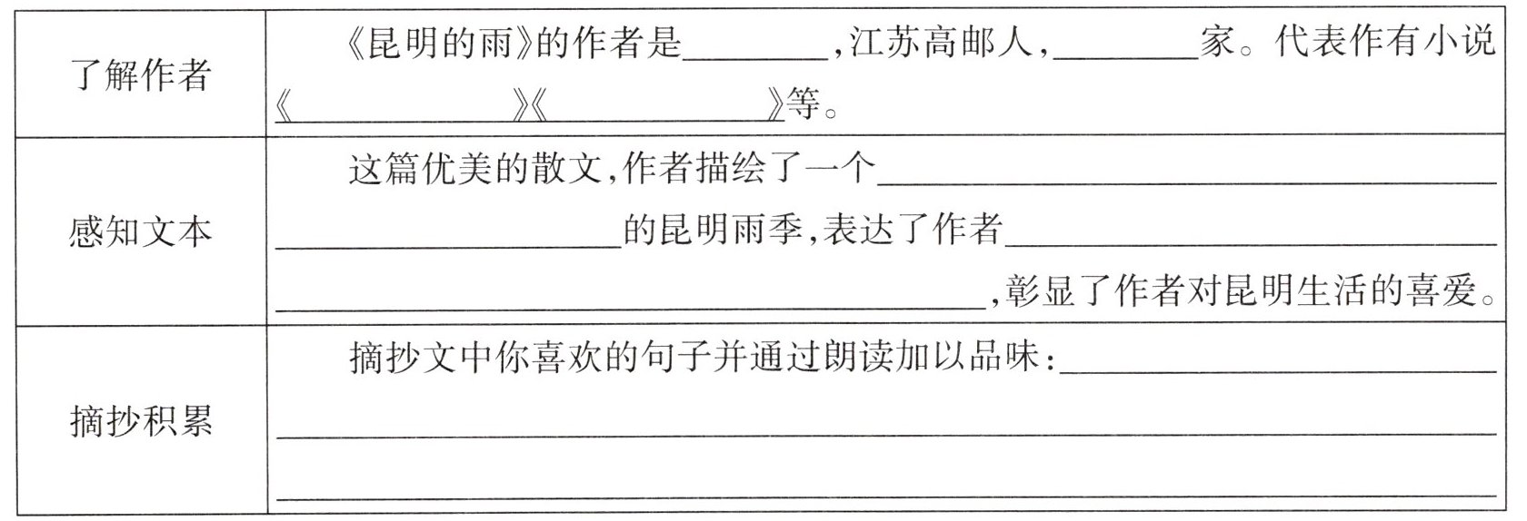 了解作者|《昆明的雨》的作者是汪曾祺,江苏高邮人,作家。代表作有小说《受戒》《大淖记事》等。|感知文本|这篇优美的散文,作者描绘了一个明亮的、丰满的,使人动情的昆明雨季,表达了作者对昆明的雨的深切怀念,彰显了作者对昆明生活的喜爱。|摘抄积累|摘抄文中你喜欢的句子并通过朗读加以品味:略|