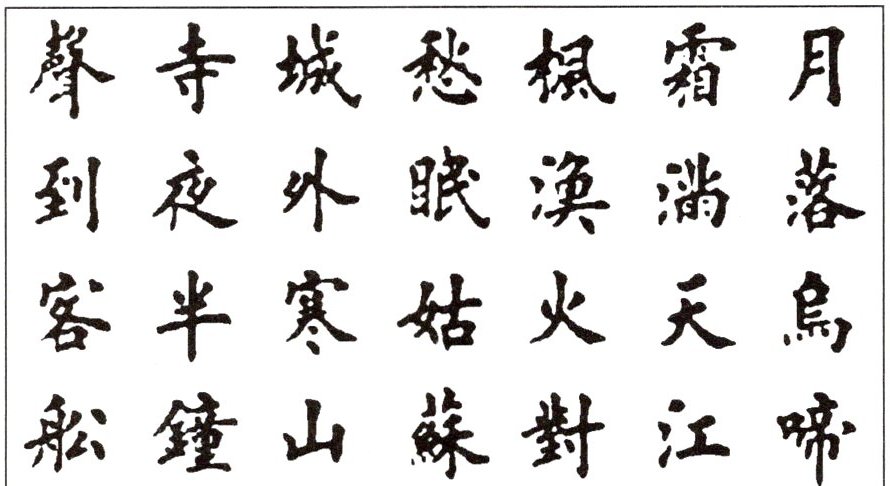 1. 小明去苏州旅游,用相机拍下了下面的书法作品,积累了《枫桥夜泊》这首诗,并与你分享。请你用简化楷体,按现代汉语书写顺序,将这首诗的前两句正确、工整、规范地书写在米字格内。