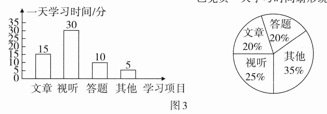 10. 如图3是甲、乙两位党员使用“学习强国”APP在一天中各项目学习时间的统计图,根据统计图对两人各自学习“文章”的时间占一天总学习时间的百分比作出的判断中,正确的是(