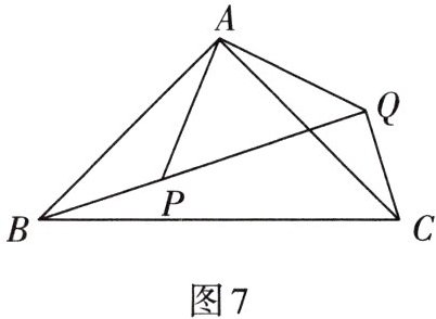 1. 如图7,在$△ABC$中,$AB= AC,∠BAC= 90^{\circ }$,P是$△ABC$内一点,将$△ABP$绕点A逆时针旋转一定角度后使得点B与点C重合.
