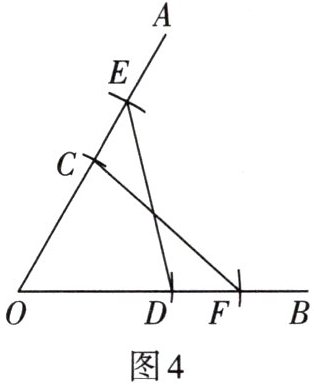 4. 如图4,已知∠AOB,以点O为圆心,任意长为半径画弧,分别交OA,OB于点C,D;再以点O为圆心,大于OC为半径画弧,分别交OA,OB于点E,F;连接CF,DE,则△EOD≌△FOC,其全等的依据是(