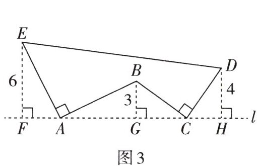 3. 如图3,已知$BA\perp AE且BA = AE$,$BC\perp CD且BC = CD$,连接$DE$,分别过点$E$,$B$,$D作经过A$,$C两点的直线l$的垂线,垂足分别为$F$,$G$,$H$,则按图中所标注的数据可计算图中实线围成的面积$S$为(