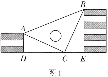 1. 如图1,王强同学用10块高度都是2 cm的相同长方体小木块,垒了两堵与地面垂直的木墙,木墙之间刚好可以放进一个等腰直角三角板($AC = BC$,$\angle ACB = 90^{\circ}$),点$C在DE$上,点$A和B$分别与木墙的顶端重合,则两堵木墙之间的距离为(