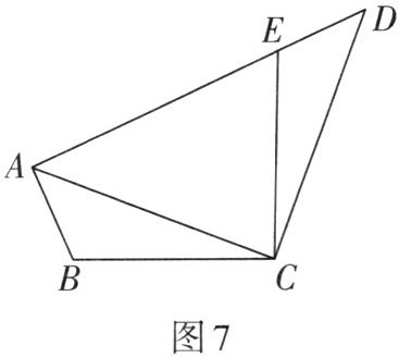 1. 如图7,在四边形$ABCD$中,$E点在AD$上,其中$\angle BAE = \angle BCE = \angle ACD = 90^{\circ}$,且$BC = CE$.请完整说明$\triangle ABC与\triangle DEC$全等的理由.