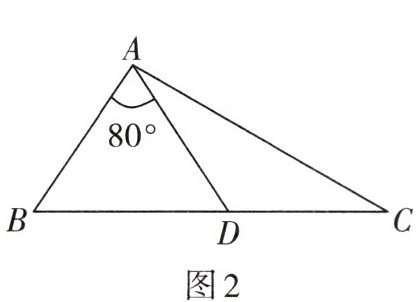 2. 如图2,在△ABC中,点D是BC上一点,∠BAD= 80°,AB= AD= DC,则∠C=