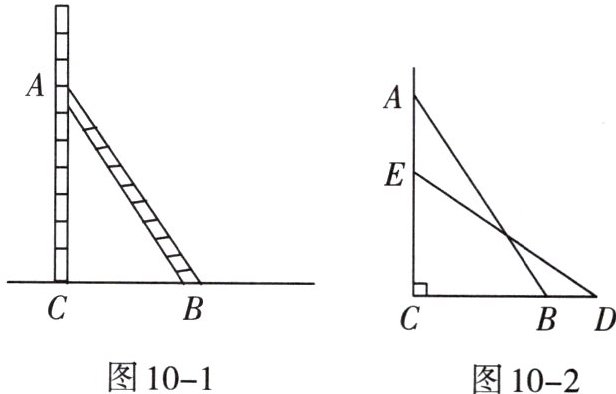 3. 如图10 - 1所示,一个梯子AB长5米,顶端A靠在墙AC上,这时梯子下端B与墙角C的距离为3米,梯子滑动后停在DE的位置上,如图10 - 2,测得DB的长为1米,求梯子顶端A下落了多少米.