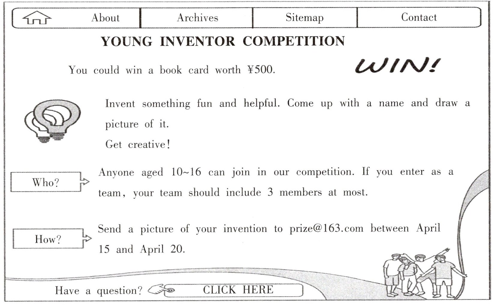 )3. What does a boy need to do if he wants to enter the competition?A. Make a book card before April 5. B. Send a letter to prize@163.com. C. Draw a picture of the invention.