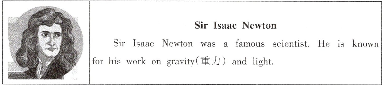 Sir Isaac Newton was a famous scientist. He is known for his work on gravity(重力) and light.