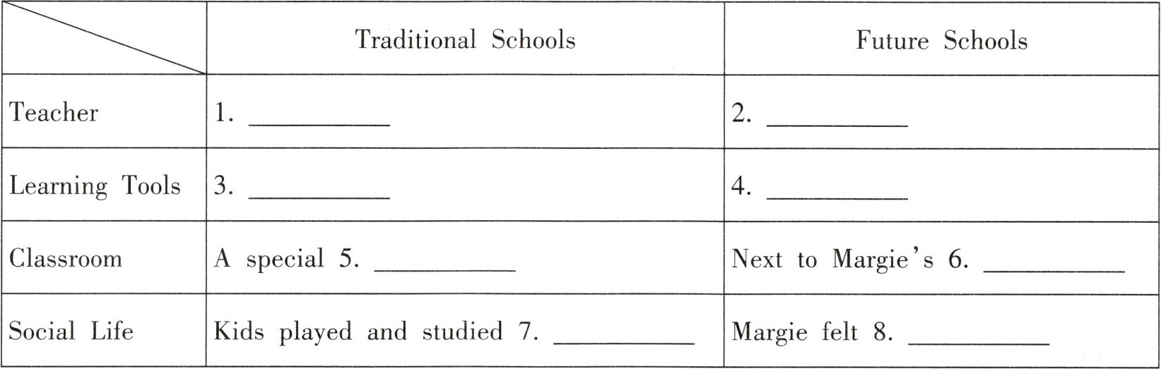 15. I'd choose a traditional school because I love learning with friends! For example, we can share ideas and do science experiments. However, Margie's future school sounds lonely with only machines. Additionally, real teachers explain things better, and playing with classmates during break is more fun than sitting alone. (言之有理即可)