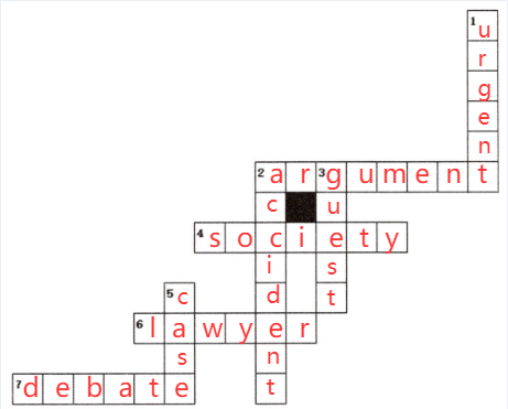 1. urgent 2. argument(横向)/accident(纵向) 3. guest 4. society 5. case 6. lawyer 7. debate