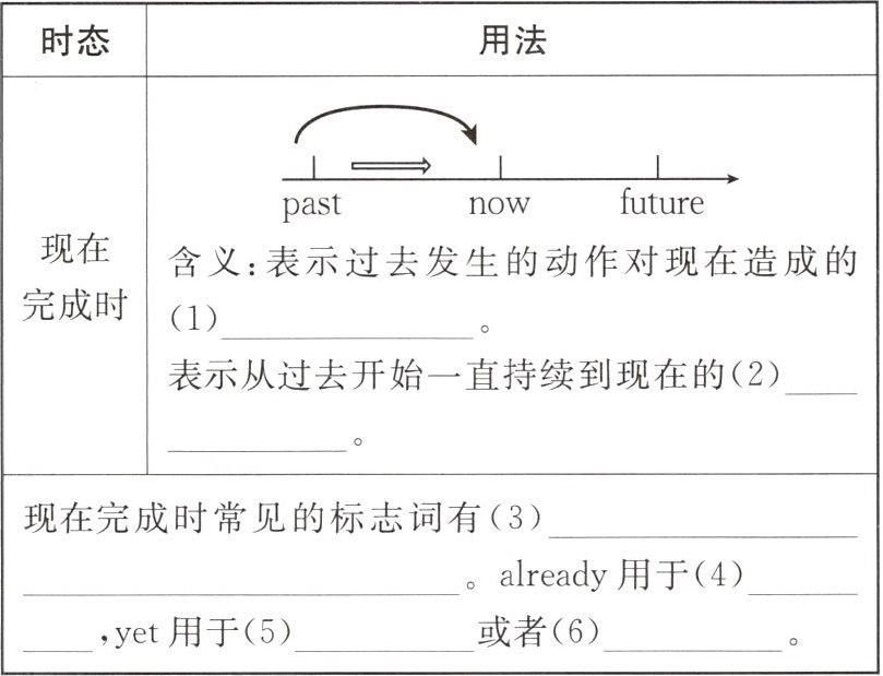 | 现在完成时 | 含义:表示过去发生的动作对现在造成的(1)______。表示从过去开始一直持续到现在的(2)______。 |