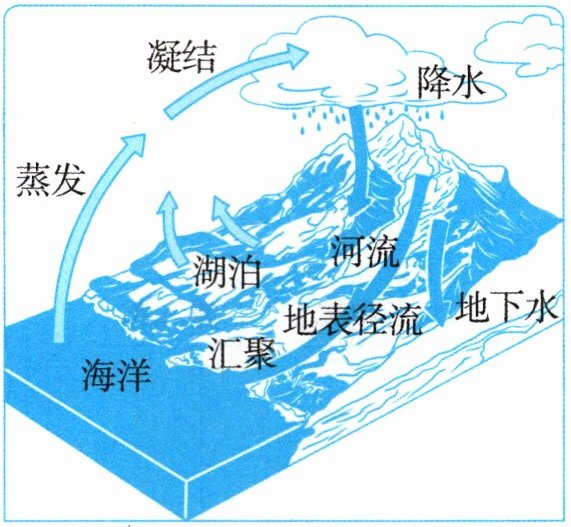 根据下图,说说水在自然界是如何循环的,是什么力量在推动水的循环。
