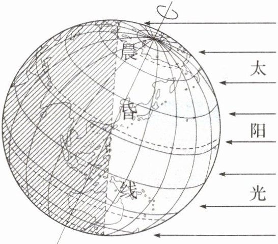 (2)在图中晨昏线两侧相应位置标注“白昼”和“黑夜”;在地轴上画出地球的自转方向。