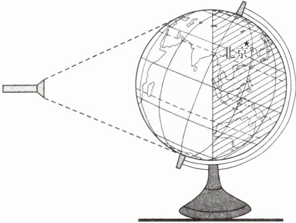 跟踪训练 右图示意某地理学习小组进行某种地理现象的演示实验,在光线较暗的地方用手电筒模拟太阳光照射地球仪,并自西向东拨动地球仪。据此完成下列各题。