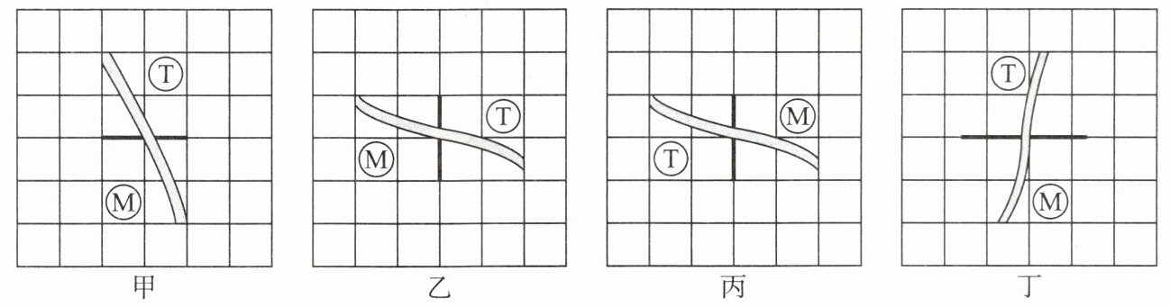 6. 某行政村东西长 2 千米,南北宽 1 千米,主干道从南向北通过,河流自东南向西北流过。该村拟修建村史馆和培训中心,分别位于该村西南部和东北部。甲、乙、丙、丁四幅图中,与上述信息相符的是( )