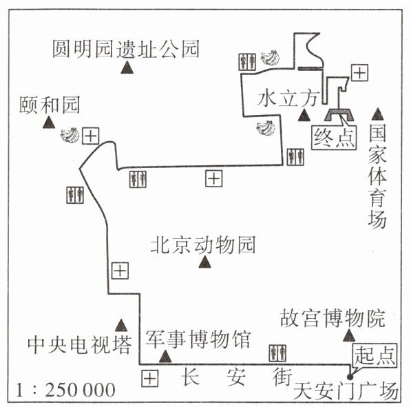 2023 年 10 月 29 日,2023 北京马拉松暨全国马拉松锦标赛(北京站)在天安门广场鸣枪开跑。读比赛路线示意图,完成 3~5 题。