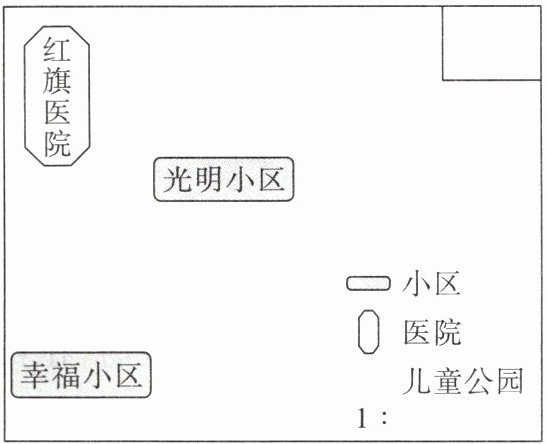 (2)题,根据幸福小区距离红旗医院正好2千米,在图上的距离为2厘米,可以得出图示比例尺为图上1厘米表示实地距离1千米;儿童公园位于光明小区东北方向2千米处,根据指向标可以得出其图中位置大致应位于光明小区正下方2厘米处。儿童公园的图例可自行设置。第