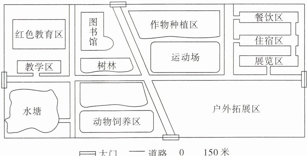 7. 某日,烟台某中学组织学生前往附近综合实践基地开展主题活动。读实践基地平面图,下列关于该基地说法正确的是( )