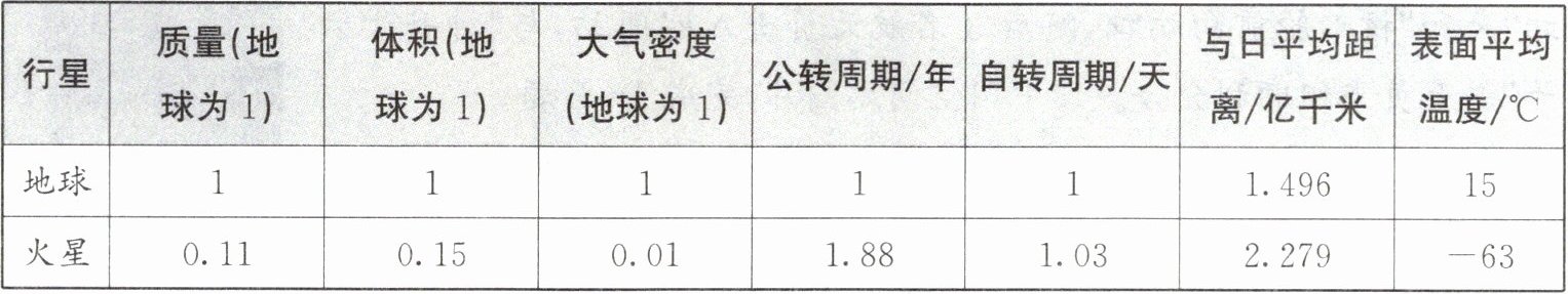 材料一 在太阳系中,火星环境与地球环境最为相似,因此人类首先选择火星作为探索生命起源和进化的行星。下表示意火星与地球的部分资料对比。