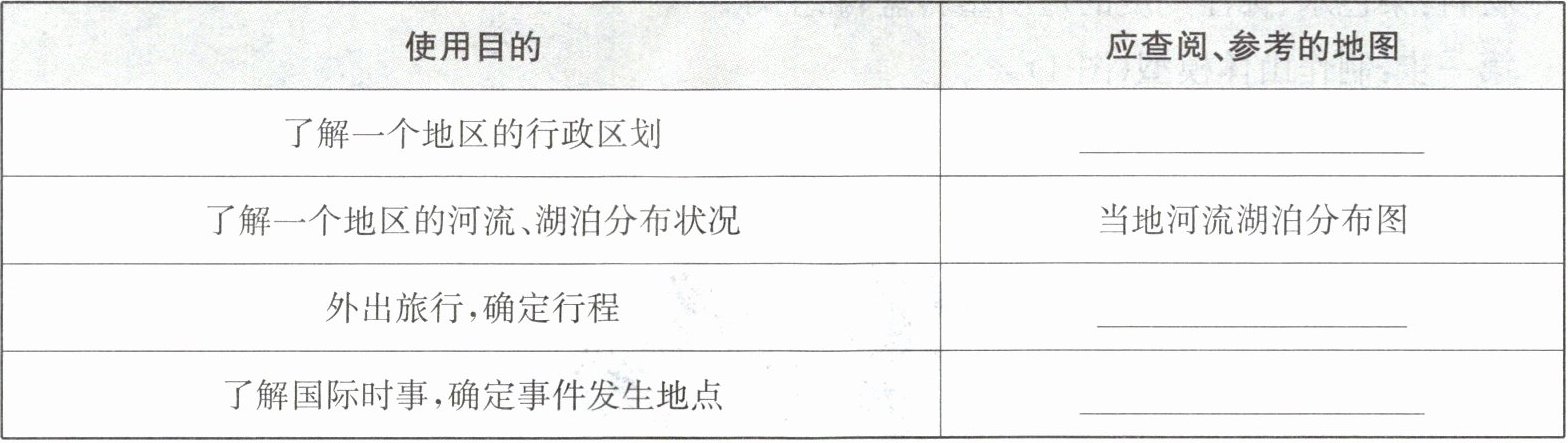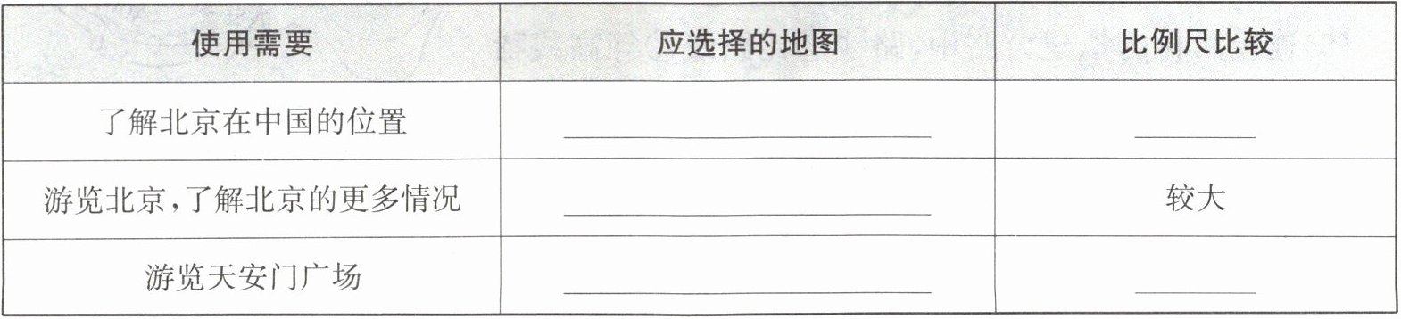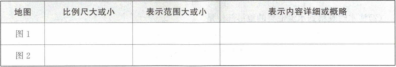 2. 认识比例尺大小与范围、内容详略之间的关系。读图,填写下表。