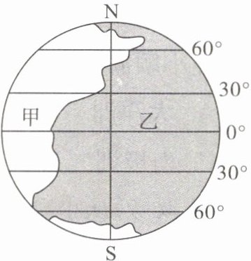 B 解析 南极附近是南极洲,为白色区域,北极附近是北冰洋,为灰色区域,所以可以判定,甲表示陆地,乙表示海洋。低纬度地区和中纬度地区海洋面积都大于陆地面积。