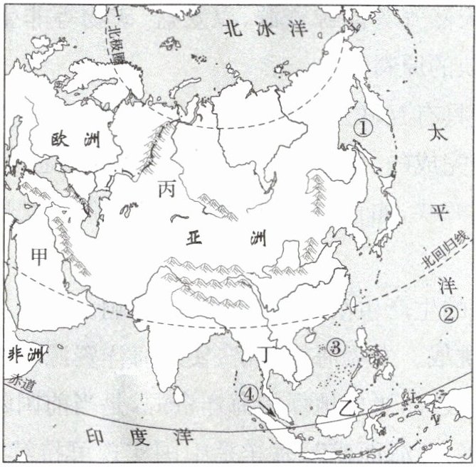 2. B 3. D 4. A 解析 第2题,甲是半岛,乙是岛屿,丙位于亚欧大陆,丁是半岛。第3题,海峡是两块陆地之间连通两个海或洋的水道,图中④所在位置为海峡,是马六甲海峡。第4题,苏伊士运河是亚洲和非洲的分界线,与亚洲和欧洲的分界线无关;亚洲和欧洲的分界线为乌拉尔山脉、乌拉尔河、里海、大高加索山脉、黑海和土耳其海峡。