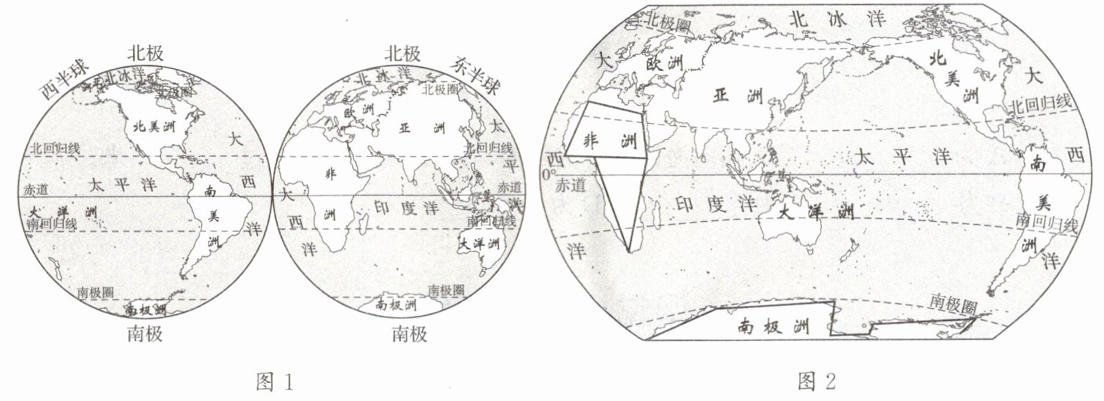 (2)题,读图1可知,纬度最高的大洲是南极洲,纬度最高的大洋是北冰洋,大部分位于西半球的大洲是北美洲和南美洲,从东半球中可以看到完整的大洋是印度洋。第