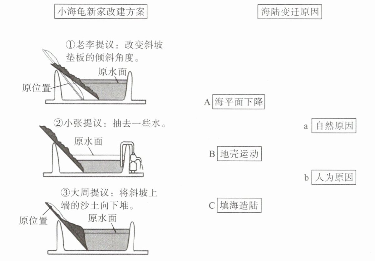 造成海陆变迁的原因与小海龟新家改建的方案有些相似,请连线示意并构建逻辑关系。