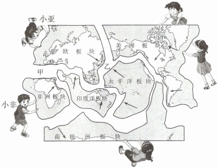 ① 小亚和小非推动板块,使得______板块与非洲板块移动并______(填“碰撞”或“张裂”),使甲海域面积______(填“扩大”或“缩小”)。