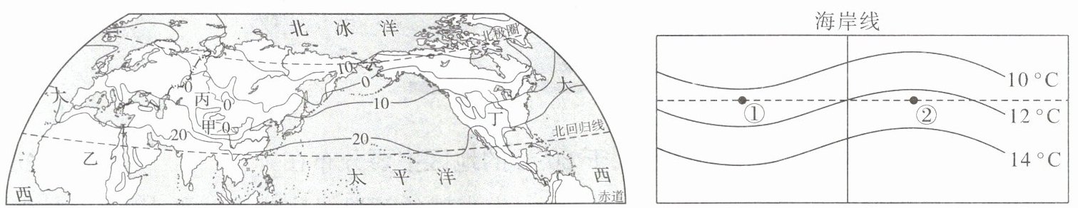 跟踪训练 读北半球年平均气温分布图(单位:$^{\circ}C$)和某地1月等温线图,完成下列各题。