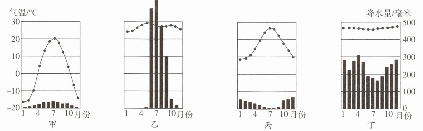 (1)根据柯本提出的气温指标,甲、乙、丙、丁中属于热带气候的是____和____,属于温暖带气候的是____。