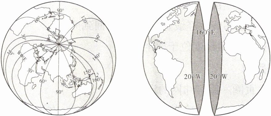 1.略 2.半圆弧 南北 3.0°经线 180° E W 4.数值相加等于180;一个在东经,另一个在西经(0°和180°经线除外)。5.20°W 160°E