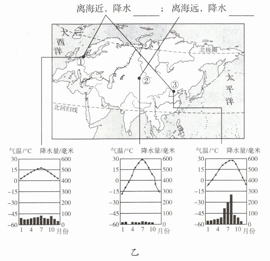 离海近,降水___;离海远,降水___